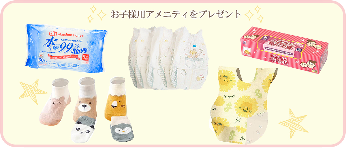 ●無料アメニティ:ベビー又はキッズ用アメニティをプレゼント。おむつ(パンパース)5枚、おしり拭き(水99%)1袋、おむつ袋4枚、食事用エプロン1枚、可愛らしい赤ちゃん靴下1組