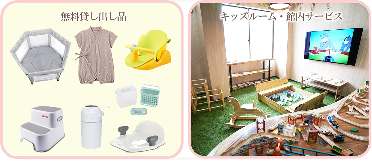 ●無料貸し出し品:おむつ用ゴミ箱、哺乳瓶消毒器、おねしょシーツなど多数取り揃えております。無料貸し出し品はこちら