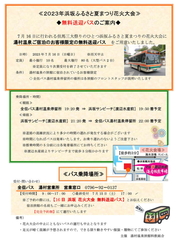 ※ご予約の際には、【16 日 浜坂 花火大会 無料送迎バス】とお伝えください